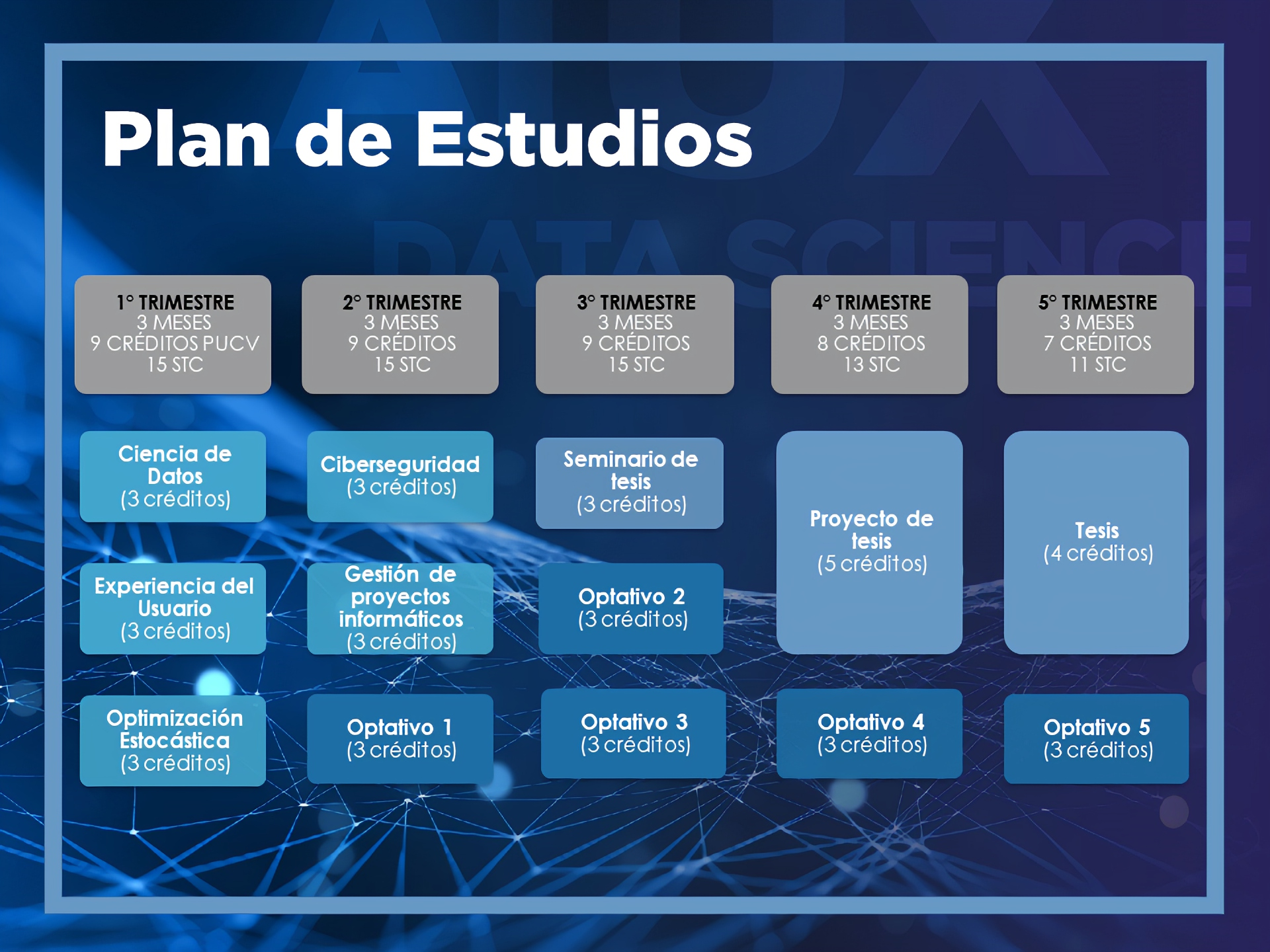 El(la) alumno(a) deberá aprobar además 5 (cinco) asignaturas optativas, de 3 créditos PUCV (5 créditos SCT), cada una, distribuidas de la siguiente forma; el segundo trimestre deberá cursar una asignatura optativa, el tercer trimestre deberá cursar dos asignaturas optativas, el cuarto trimestre deberá cursar una asignatura optativa y el quinto trimestre deberá cursar una asignatura optativa.